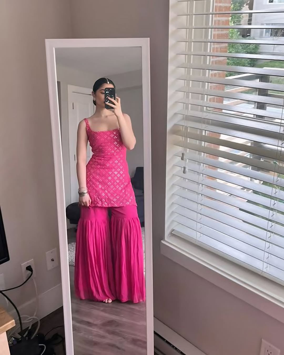 This Hot Pink Designer Sharara Suit is crafted for women who love to blend elegance with modern glamour. Inspired by contemporary festive fashion, this outfit is a perfect choice for weddings, festivals, parties, and special celebrations where you want all eyes on you.