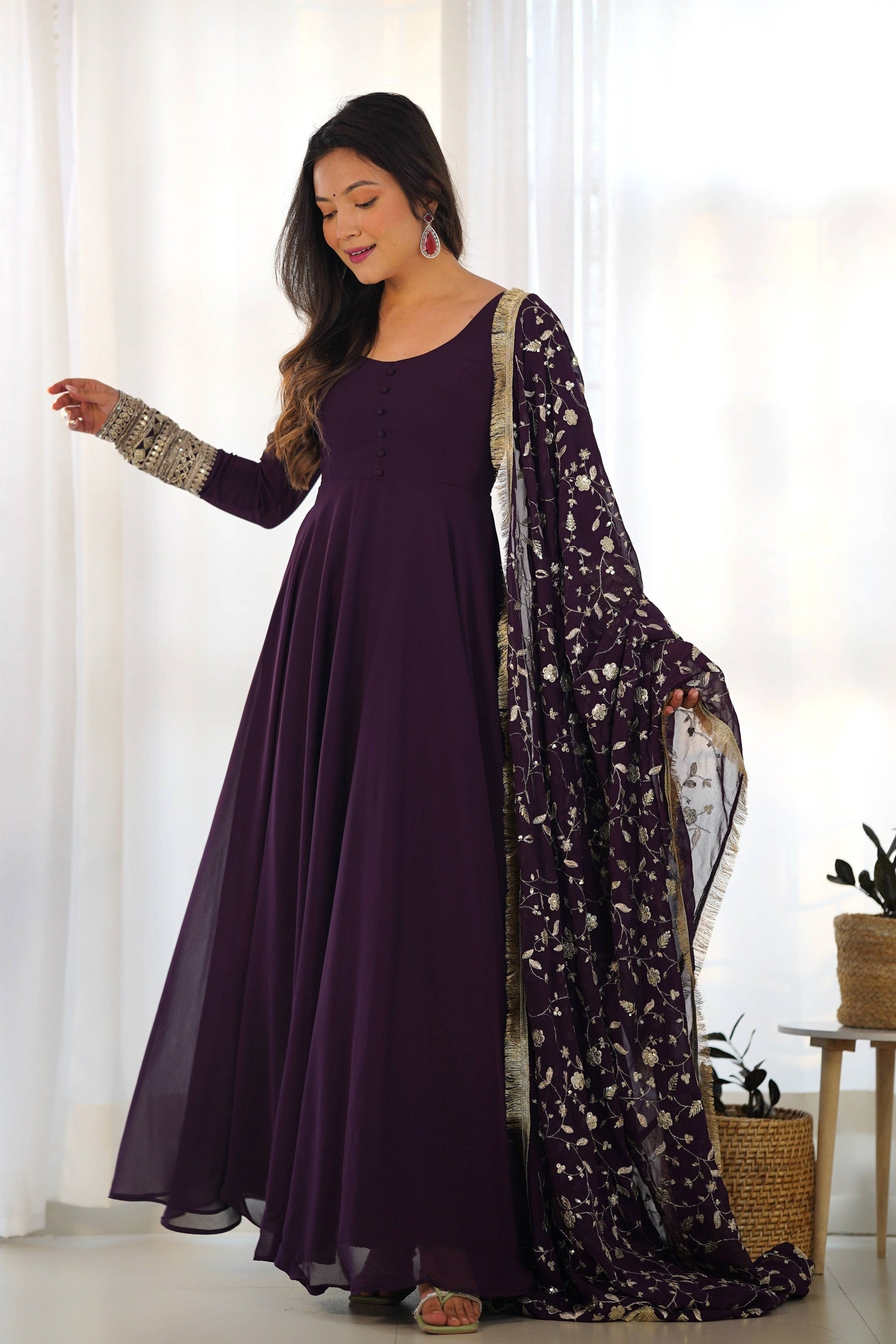 Step into elegance and sophistication with our Elegant Wine Color Georgette Gown Full Set with Dupatta. This exquisite ensemble, crafted from heavy, soft fox georgette, features intricate detailing and a luxurious drape that ensures you make a statement at any event. With its stunning 7-meter flair, sequined sleeves, and jari work, this gown is perfect for those who appreciate the finer things in fashion. This Gown Is Designed for elegance and comfort; this ready-to-wear set is ideal for various occasions, making it a must-have addition to your wardrobe.